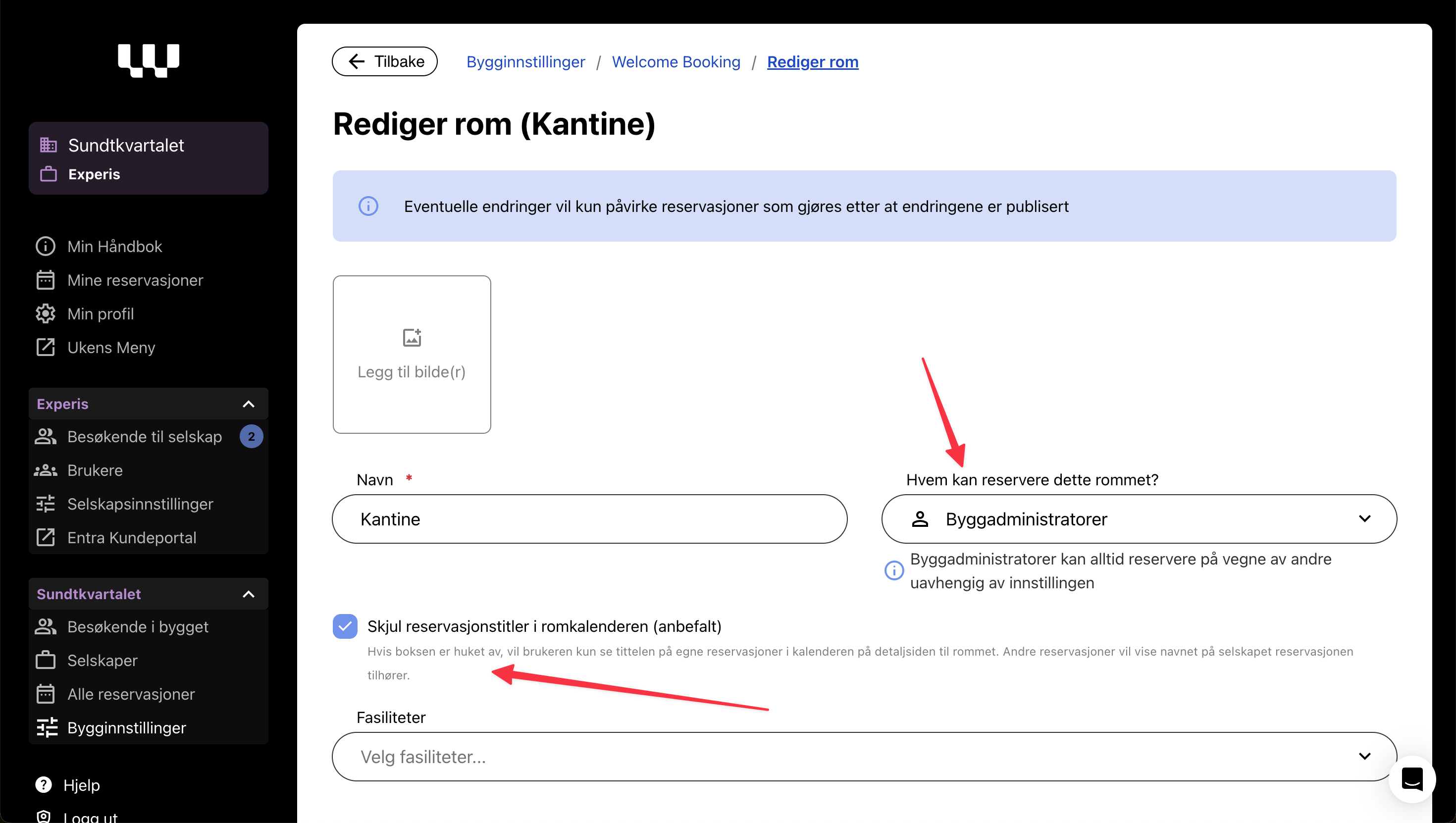 Nytt rominnstilling: Begrens bookinger til enten selskapsadministratorer eller byggadministratorer.